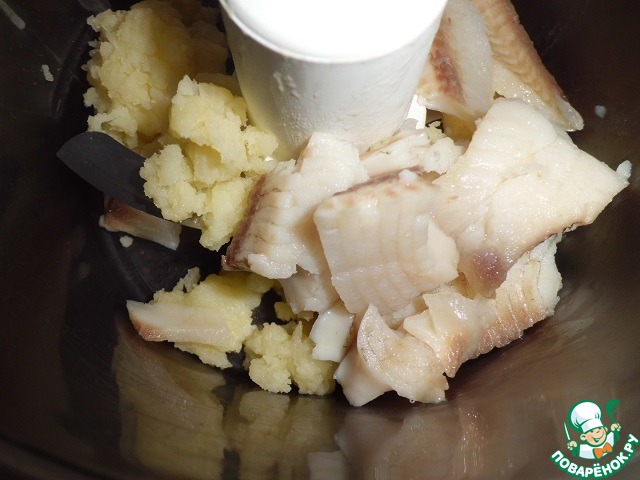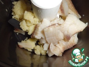 Рыбу тоже немного проварить (буквально несколько минут после закипания). С помощью комбайна (блендера) приготовить рыбно-картофельное пюре. Добавить соль и специи, по вашему вкусу (я не добавляла).