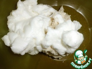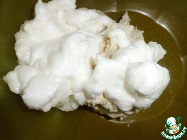 Белки взбить и очень аккуратно ввести в общую массу, тщательно вымешивая.