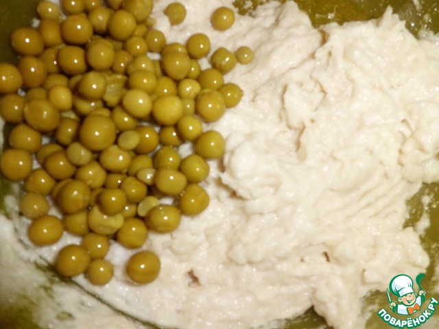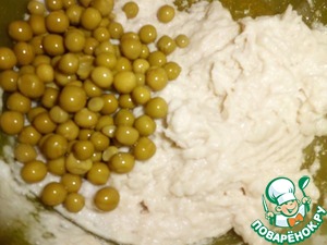 Добавляем зеленый горошек и тоже аккуратно вмешиваем его в наше будущее суфле.