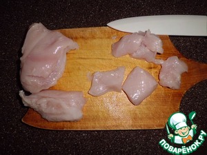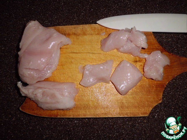 • Куриное филе нарезаем на кусочки (не очень крупные).