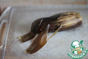 Готовые баклажаны при накалывании вилкой должны быть мягкие. Снимаем кожуру с овощей.