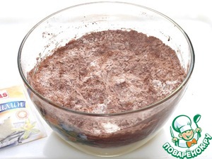 • Сверху на масляную массу просеять муку вместе с какао-порошком и крахмалом, добавить щепотку соли.