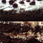 К сожалению поднялся с одной стороны, но вкус от этого не потерялся. На ночь его не "дозревала" в холодильнике. Пекла в форме 26 см. Разрезала на 3 части, пропитала коржи кофейно-коньячной пропиткой. Крем на нижний слой взяла заварной,(хватило на один слой, не рассчитала по количеству) на остальные слоя взяла крем сливочно-сметанный (Крем :сливки 33% холодные 200 гр. всбить до устойчивых пиков, добавить 100 гр.охложденной сметаны 15% (была такая сметана) +40 гр. сахарной пудры. Все аккуратно перемешать, крем готов.)