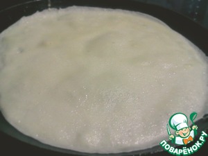 Хорошо прогреть сковороду, смазать сливочным маслом и вылить порцию теста.