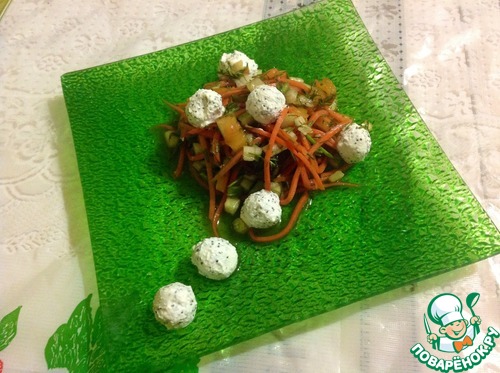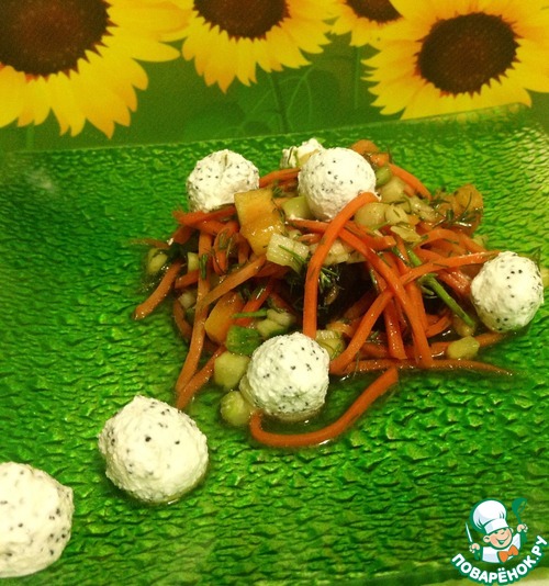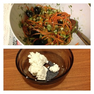 Салат перемешать, если не хватает соли чуть подсолить. Творог смешать с маком и скатать шарики размером с вишню. Чтобы творог не лип к рукам, смочить их немного водой.