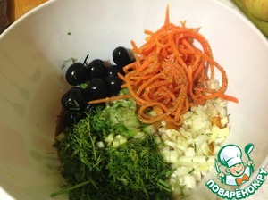 Сельдерей очистить и мелко порезать кубиками, добавить корейскую сорковь и мелко нашинковать укроп