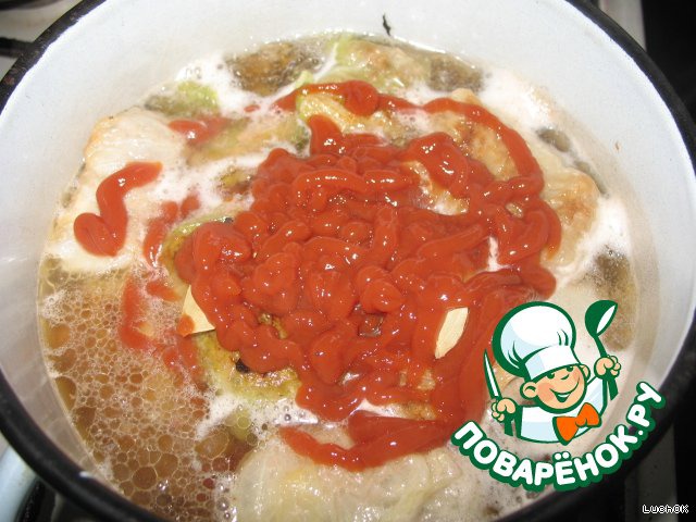 Ставим на огонь и даём воде закипеть. Как закипело - добавляем томатную пасту или кетчуп. Ложки 2-4.