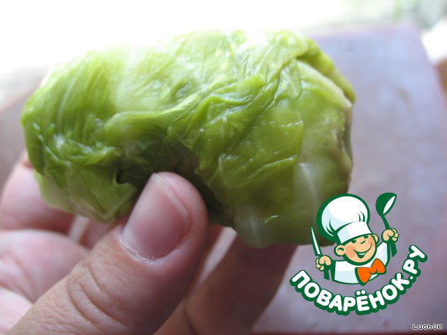 Кочан капусты разобрать на листья. Листья немного отварить в подсоленой воде до полумягкости. Это примерно минут 10-15. Воду слить, остудить листья, разложить их на доске и немного отбить утолщения деревянным молоточком. Не используйте металлические молотки (такие как для мяса) они могут повредить листья. А нам они нужны целенькие!