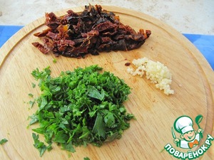 Я использую вяленые томаты 2-х видов: сладкие и слегка кисловатые. Мне на гостинец привезли их с Кипра. За неимением легко можно использовать вяленые томаты собственного приготовления.