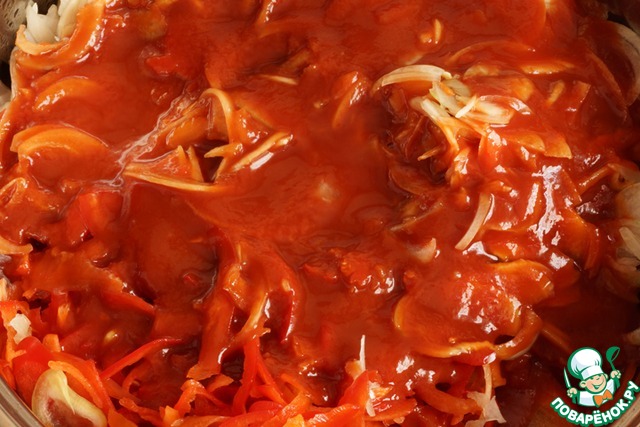 Хочу обратить внимание на следующее, кому нравится могут вместо томатной пасты приготовить свой сок из прокрученных помидоров, мне же в заготовках больше нравится именно томатная паста, натуральная, промышленного производства, с ней получается более пикантный вкус.