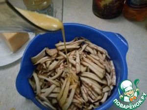 Баклажаны (синенькие) нарезаем тонкими полосками и залить взбитыми яйцами. Перемешать и отставить на 1,5-2 часа