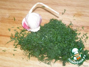 Порезать укроп, помять чеснок (если блюдо предназначено к детскому столу, то чеснок, конечно, отменяется:), хотя мой двухлетний ребенок с удовольствием кушает еду "с запахом чесночка")
