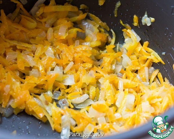 3. Лук нарезать мелким кубиком, морковь натереть на терке. В чашу мультиварки налить 2 ст. л. масла. Выбрать режим Выпечка или Жарка и обжарить лук и морковь в течении 7-10 минут до мягкости.