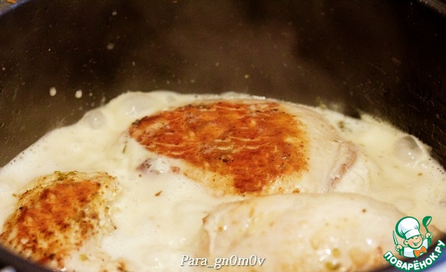 7. Пока рулеты жарятся прогреть сливки на плите или в микроволновой печи. Это необходимо, чтобы сливки не свернулись. Влить к обжаренным рулетам вино, чуть его прогреть, добавить горячие сливки, приправы, соль и готовить 10 минут на режиме Выпечка. В небольшом количестве воды комнатной температуры (2 ст. л. примерно) развести крахмал и ввести его в соус. Готовить на режиме Выпечка еще 5-7 минут до загустения соуса.