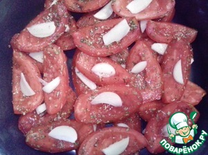 На дно мультиварке выкладываем помидоры, но старайтесь что-бы попадало как можно меньше сока помидор. на каждый кусочек помидора кладем чеснок