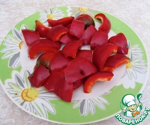 Болгарский перец очистить от семечек, нарезать широкими полосками.