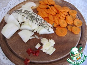 Чеснок очистить, раздавить ножом, очищенную морковь нарезать кольцами, очищенный лук - полукольцами, жгучий перец очистить от семян. Тимьян у меня сушенный.