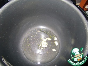 В чашу мультиварки налить 2 столовые ложки растительного масла, включить режим "Поджаривание", положить веточку тимьяна и зубчик чеснока.