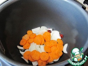 Положить в чашу мультиварки лук, морковь, обжаривать до золотистого цвета.