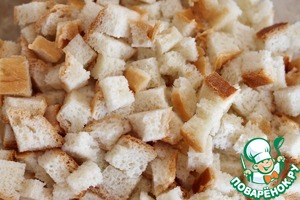 Батон нарезать мелкими кубиками, залить теплым молоком, дать постоять 10 минут.