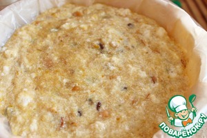 К хлебу добавить растопленное сливочное масло, желтки, изюм вместе с жидкостью, перемешать. Затем аккуратно ввести белки. Контейнер-пароварку застелить пергаментом и смазать растительным маслом. Выложить массу.