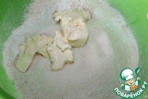 Добавляем сахар и сливочное масло, порубленное кусочками, перемешиваем.