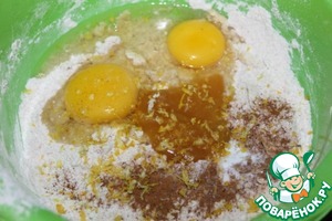 Добавляем яйца, мёд (растопленный), корицу, цедру лимона и ванилин, замешиваем тесто.