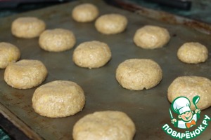 Противень застелите пекарской бумагой или как у меня силиконовый коврик. Руки можно немного смочить водой, от теста отщипните кусочек, скатайте в шарик размером с большой грецкий орех, положите на противень и приплюснете, оставляйте промежуток между печеньями 2-3см.