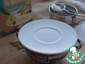 Отмерим рисовые хлопья. Так как на коробке в инструкции по приготовлению указано соотношение 1:2, то хлопья я сначала отмерила в милилитрах, а потом взвесила. Получилось 65г. Забегая вперед скажу, что в таком соотношении каша получилась густой и есть смысл для получения желаемой густоты соотношение хлопья/молоко менять. Хотя это -дело вкуса.