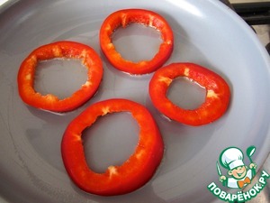 Сезонный перец очистить от семечек, нарезать кольцами, выложить на разогретую с растительным маслом сковородку.