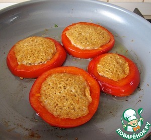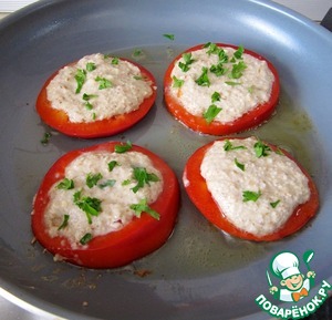 Заполнить перец тестом для оладий, посыпать с одной стороны зеленью. Жарить на низком огне 3-4 минуты.