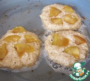 Яблоко очистить от сердцевины, нарезать произвольным плоским квадратом. Выложить оладьи на разогретую с растительным маслом сковородку, на каждый оладушек выложить кусочки яблока. жарить с двух сторон до золотистого цвета!