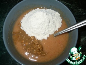 Добавить муку, смешанную с разрыхлителем и ванилином, и замоченные овсяные хлопья. Быстро перемешать до однородности