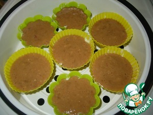 В чашу мультиварки налить кипятка до нижней отметки. Сверху поставить контейнер-пароварку. Поставить в неё наполненные приготовленной массой силиконовые формочки, смазанные сливочным маслом. Мультиварку закрыть. Установить режим"Пар" 25 минут (у меня идёт отсчёт от начала закипания воды)