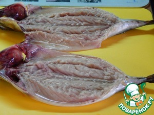 Скумбрию разрезать по брюшку, выпотрошить, удалить хребет, обязательно удалить глаза и жабры, чтобы рыба не горчила.