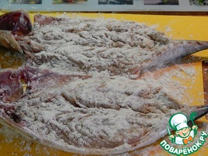 Обжаренную рыбу выложить на противень. На спинку рыбы выложить половину соуса.