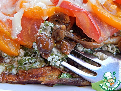 На грибы оставшийся соус, сверху помидоры дольками и сыр. Отправить в духовку на 5-6 минут при темп.200 градусов.