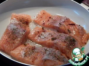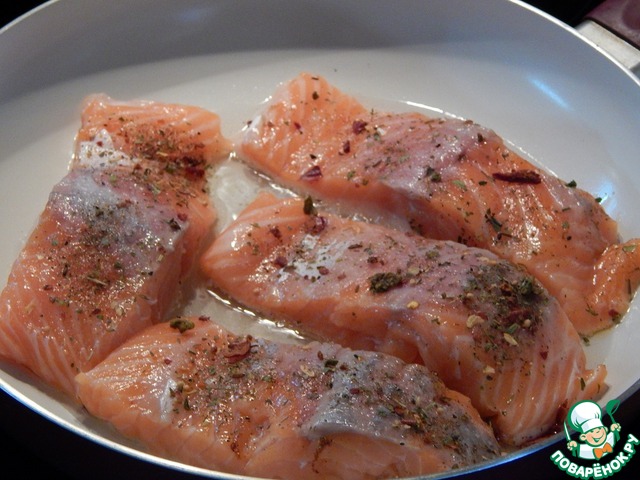 Рыбное филе нарезать кусками толщиной 1-1,5 см. Сбрызнуть соевым соусом и поперчить (можно использовать любые специи). Обжарить в течение 7-8 минут.