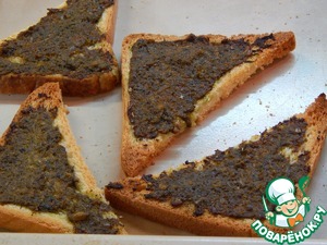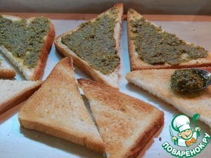 Тостовый хлеб поджарить в тостере. Намазать получившейся пастой. Выложить на противень и поставить в духовку на 4-5 минут при 180 град.