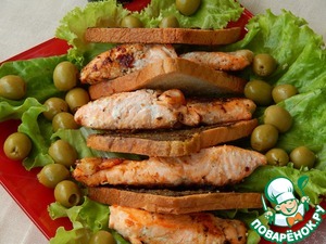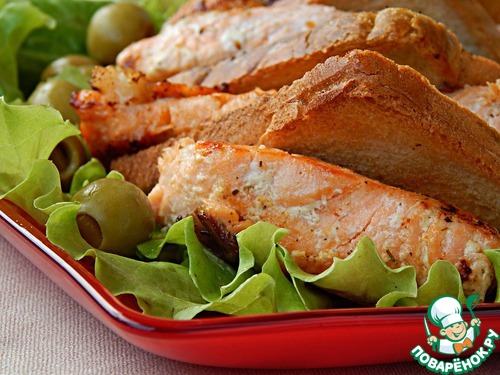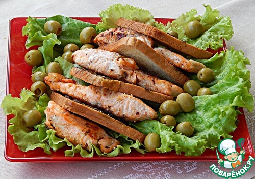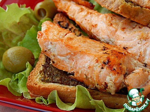 Аккуратно выкладываем рыбу на салатные листья, чередуя с тостами. Украшаем оливками и подаем к столу.