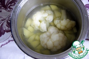 Картофель очистить и нарезать небольшим кубиком, отрезать соцветия цветной капусты (я использовала цветную капусту из заморозки, не размораживала), варить до мягкости овощей, 15-20 мин.