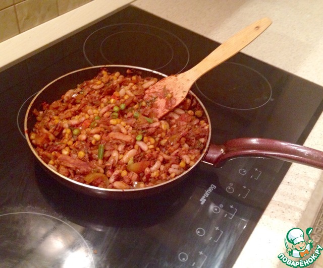 Добавить в сковороду фасоль, кукурузу и зелёный горошек. Приправить солью и перцем по вкусу. Жарить, помешивая, ещё около 5 минут. -