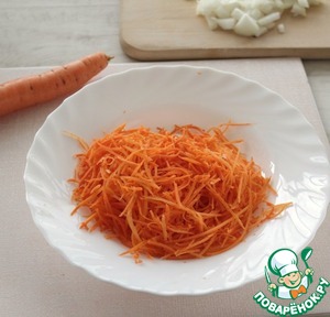 Морковь натереть на крупной терке, лично мне нравится, когда морковь натерта соломкой.