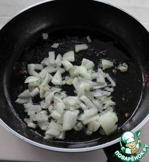 В сковороде, где жарилась рыба, по необходимости добавить растительное масло, нагреть его и обжарить лук до прозрачности.