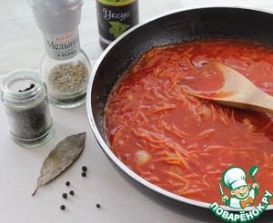 Положить томатную пасту, приправить специями по вкусу, долить кипяченой воды, уксус, посолить, дать маринаду немного провариться. Попробуйте на вкус, выровняйте. Маринад должен напоминать консистенцию соуса.