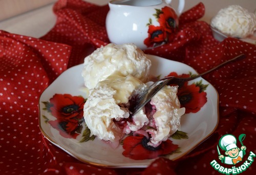 Берем примерно столовую ложку массы, на нее – ягодку. Если ягодка мороженая, так и кладем, размораживать совсем не обязательно. У меня вот с мороженой клубникой. Руками формуем шарики с ягодкой внутри. Я это не сфотографировала, поскольку руки были в твороге… Вот такие у меня получились, размером с абрикос.