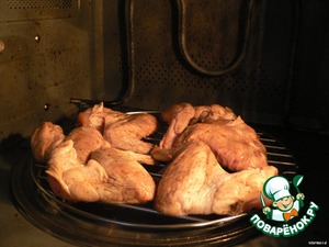 Выложите крылья на решетку в микроволновке тонкими кончиками вовнутрь. Влезают все 8 крыльев.