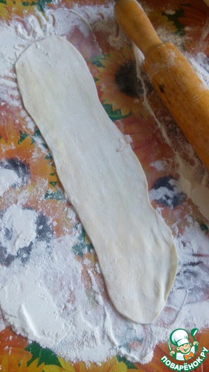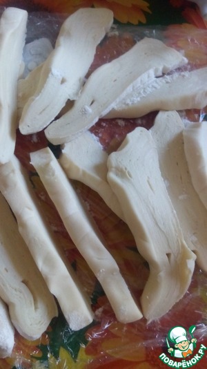 Тесто беру готовое слоеное дрожжевое. Разрезать его на полоски по количеству кусочков курицы. Так же нарезать полосками сыр.