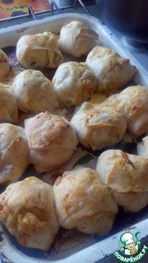 Сложить на противень. Можно смазать яйцом, но я смазываю остатками маринада. И поставить в разогретую до 200 градусов духовку на 30-40 минут.