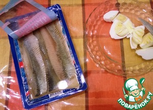 250 г филе сельди нарезаем произвольными кусочками. Если используем лук и чеснок – их тоже очищаем и нарезаем, я не брала – с утра не хотелось благоухать :), и так получилось очень вкусно.